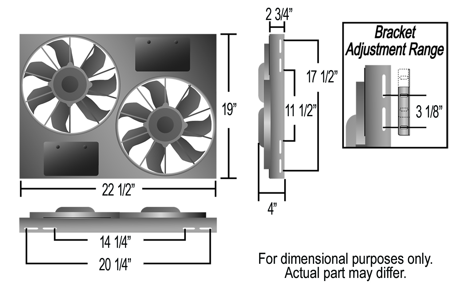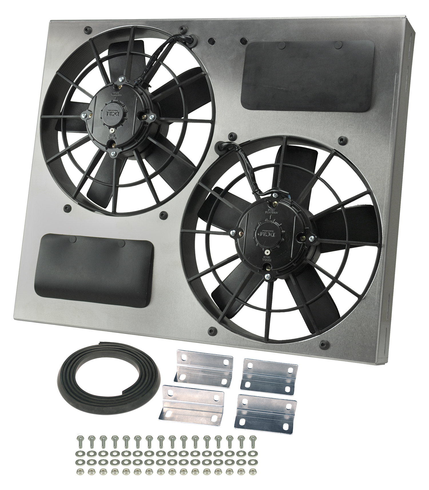 This Dual High Output RAD Fan Powerpack Assembly allows true Dual Fan performance in a package the size of other Single shrouded fans. Featuring an aluminum shroud measuring a tidy 22 1/2" wide by 19" top to bottom and only 4 1/2" in overall depth to offer an adjustable yet precision fit, it uses two IP-68 certified waterproof/dustproof 11" electric fans to provide a powerful one-two 3750 cfm punch to a hot engine. The natural, non-finished aluminum shroud gives the user the freedom to polish, anodize, paint, or simply leave it raw to create a truly custom look at a reasonable price.