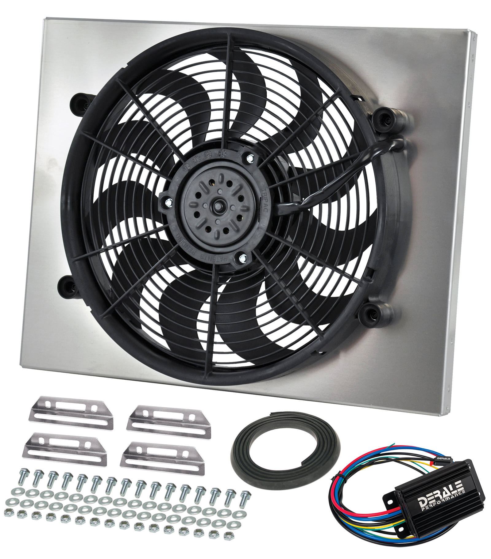 Get complete control of your engine temperature! Derale Performance has combined their high-performing shrouded powerpacks with the ultimate fan controller. Using a high output electric fan incorporated into an engineered shroud, this powerpack can conquer even the most difficult cooling conditions. This unit features an Aluminum shroud measuring 20-3/4" wide by 17-5/8" top to bottom and is only 3" in overall depth to offer a precision fit. This 17" high output two-speed fan is one of the best in our line-up offering up to 2400 CFM and is specifically designed to thrive on thick, tight fin radiator cores.