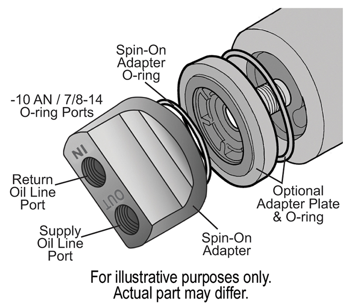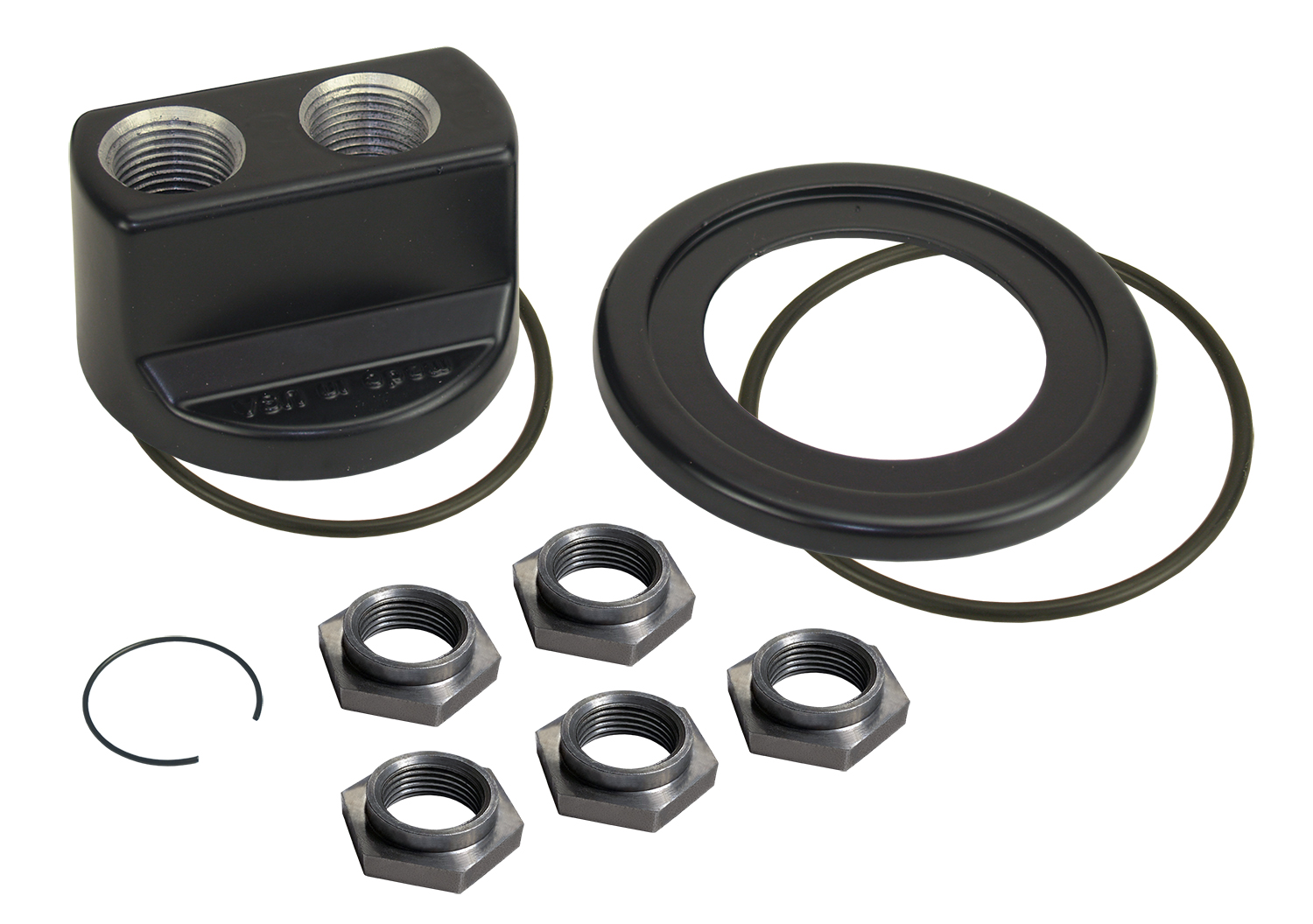 This high quality die-cast aluminum spin-on adapter boasts a billet look at a reasonable price. With -10AN (7/8"-14) O-ring ports and 5 filter nipples included this Premium Series adapter fits most passenger vehicles with 2 1/2" to 3 1/2" engine filter landings. It provides external oil lines to allow the addition of an engine oil cooler and/or remote filter mount, installing at the stock engine oil filter location. Also features a durable black powder coat finish.
