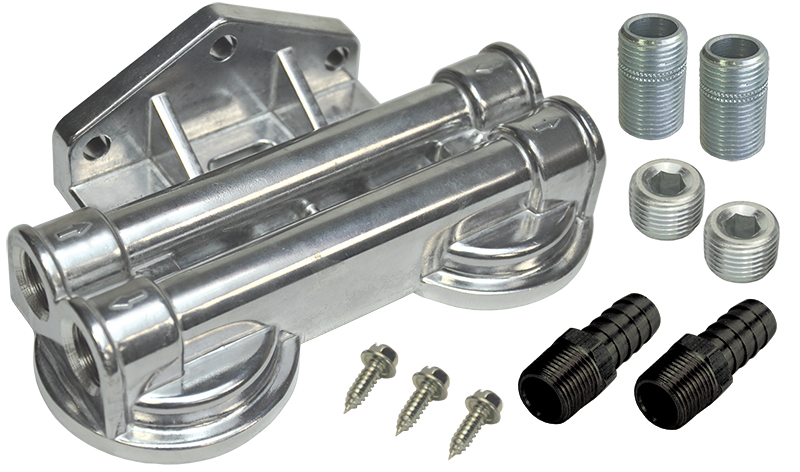 High quality aluminum die cast remote dual side port mount allows the use of two filters for additional fluid filtering capabilities. Comes with 1/2" NPT inlet & outlet ports and 3/4"-16 filter threads. Filter mount uses Fram PH8A Oil Filter or equivalent.