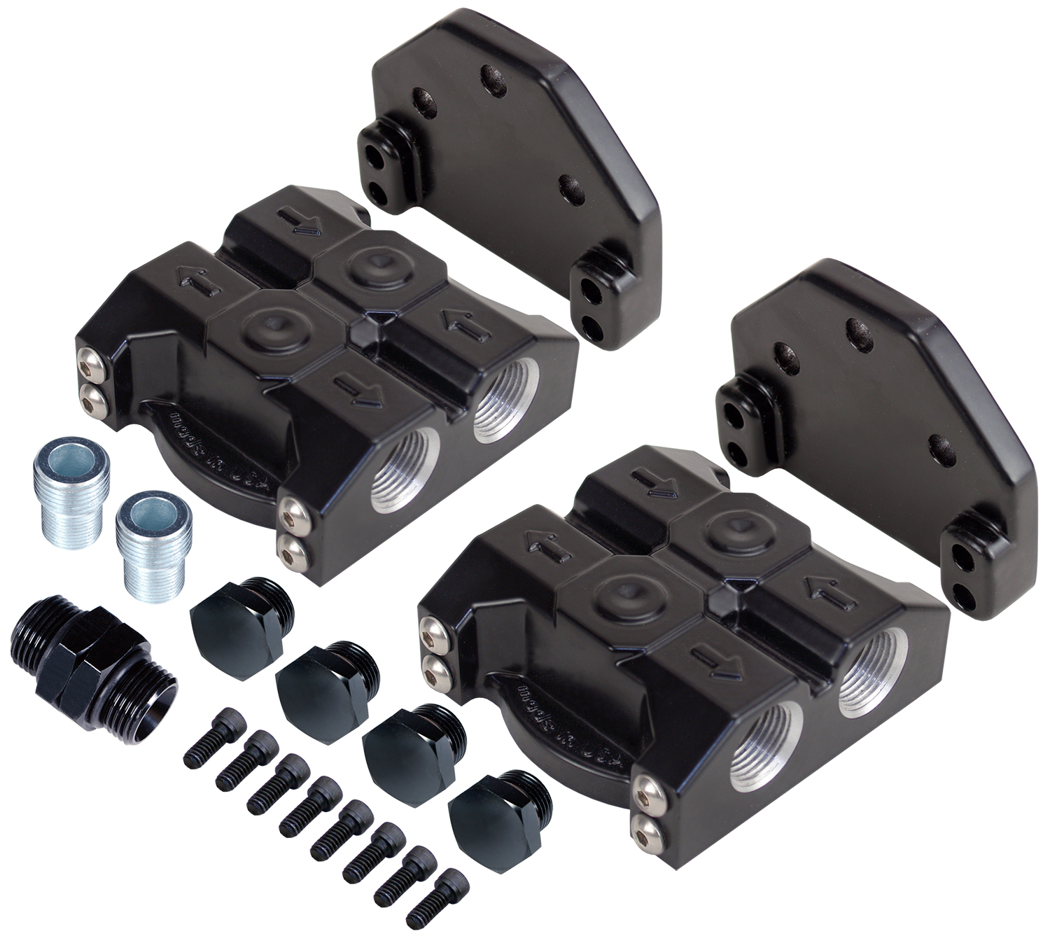This true dual filtration system includes two high quality aluminum die cast mounts and an aluminum coupler fitting for additional fluid filtering capabilities. Featuring -10AN (7/8"-14) O-ring inlet & outlet ports, these beautifully finished remote filter mounts are designed with the expensive billet look, but without the billet price tag. Also features a durable black powder coat finish. Filter mount uses Fram PH8A oil filter or equivalent.