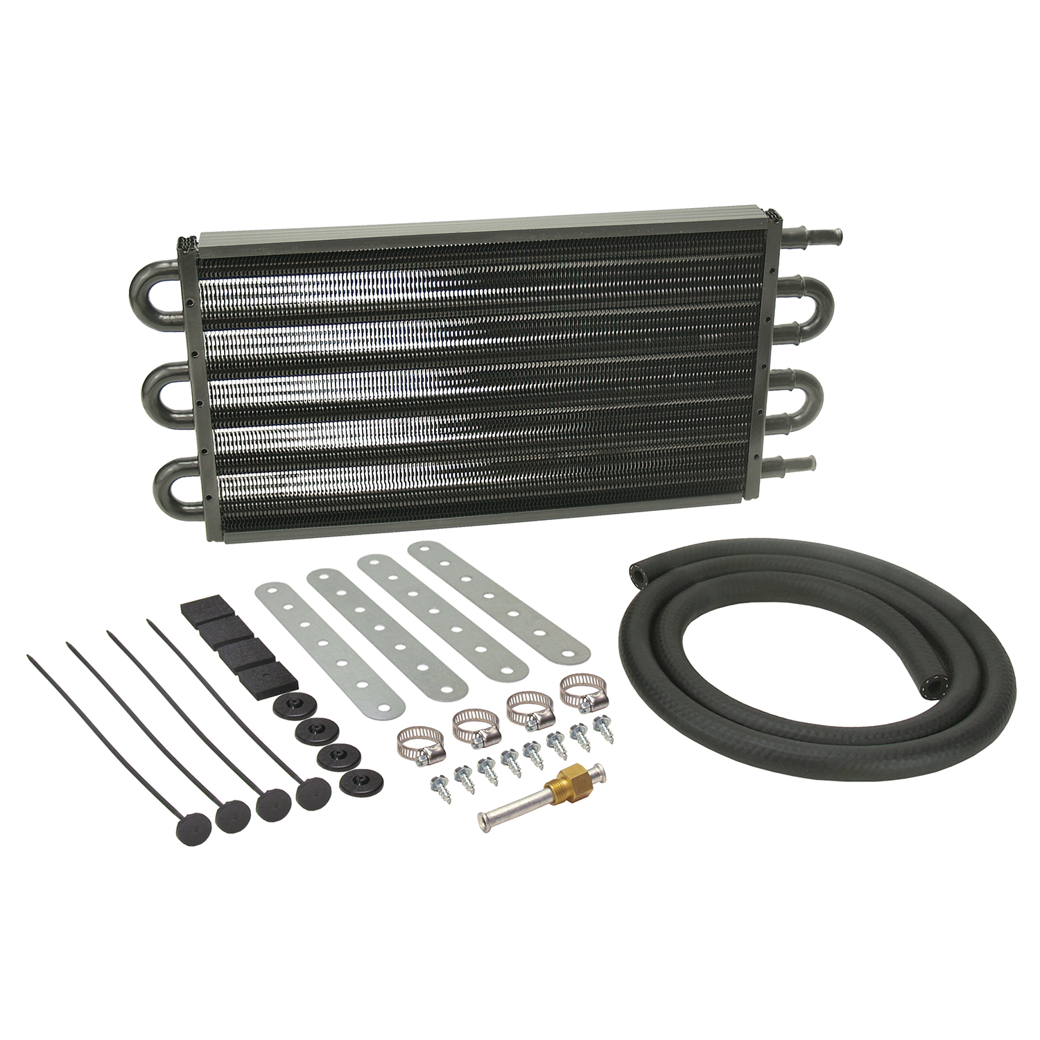 This Tube & Fin transmission cooler features 1/2" copper tubing expanded into aluminum cooling fins. Perfect for medium-sized cars and compact trucks and SUVs' that see light duty towing, they improve shifting performance and extend the life of the transmission by eliminating heat-related transmission failures. This kit comes with a complete transmission cooler hardware kit to easily install onto vehicles with 5/16" transmission cooler lines.
